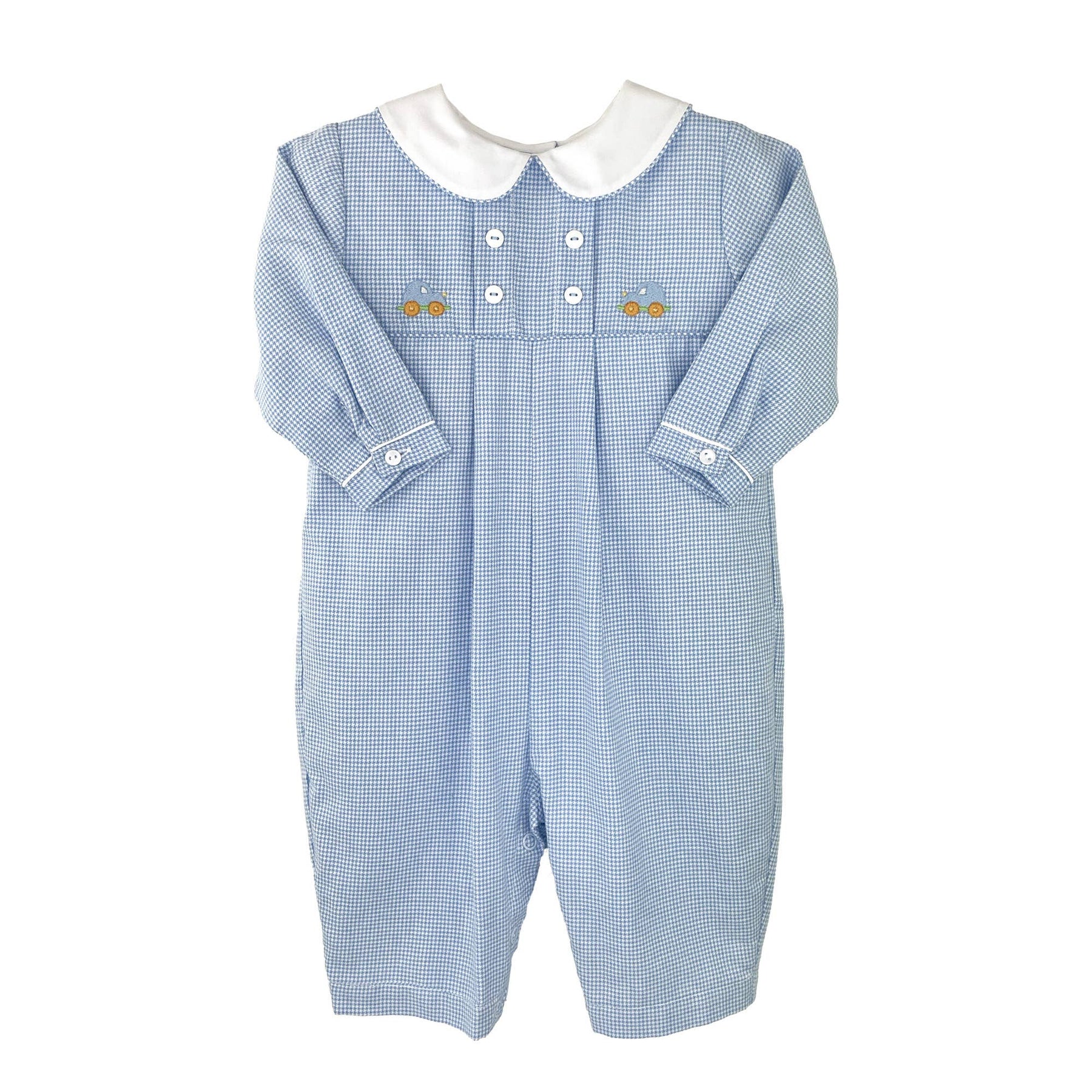 Our Hand-Smocked Cars Boys Longall combines classic Southern charm with everyday comfort. Featuring a blue gingham fabric, white Peter Pan collar, and hand-smocked car detail, this timeless outfit is perfect for church, portraits, and special occasions. Designed with button cuffs and snap closures for easy dressing, it’s a polished piece for your little gentleman’s wardrobe.
