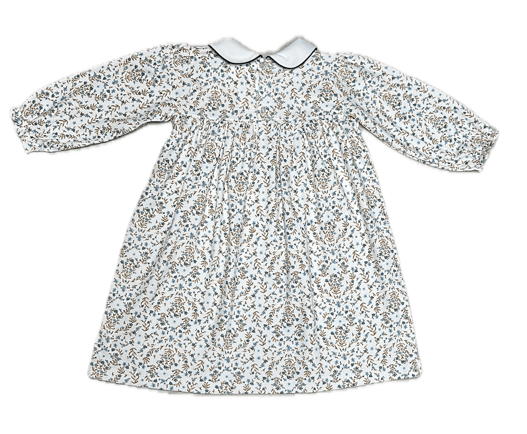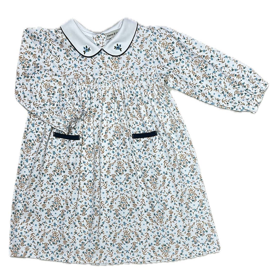 Our Blue Floral Embroidered Collar Float Dress is a timeless piece designed for the little girl who loves classic charm. This darling long sleeve dress features a delicate floral print in soft shades of blue and gold, complemented by a white Peter Pan collar adorned with sweet embroidered flowers and navy trim. Thoughtful details like gathered pleats and navy pocket accents add a refined touch, perfect for everyday elegance or special fall occasions.