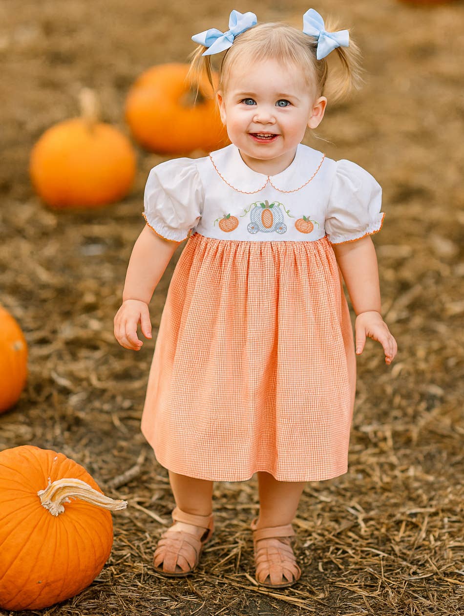 Make fall moments extra sweet with our Pumpkin Carriage Girls Thanksgiving Dress, a classic heirloom piece full of seasonal charm. Featuring a hand-smocked pumpkin carriage design, orange gingham fabric, and a white Peter Pan collar with contrast stitching, this darling dress is perfect for Thanksgiving celebrations, family portraits, and autumn gatherings. A timeless favorite designed for comfort, tradition, and holiday memories.
