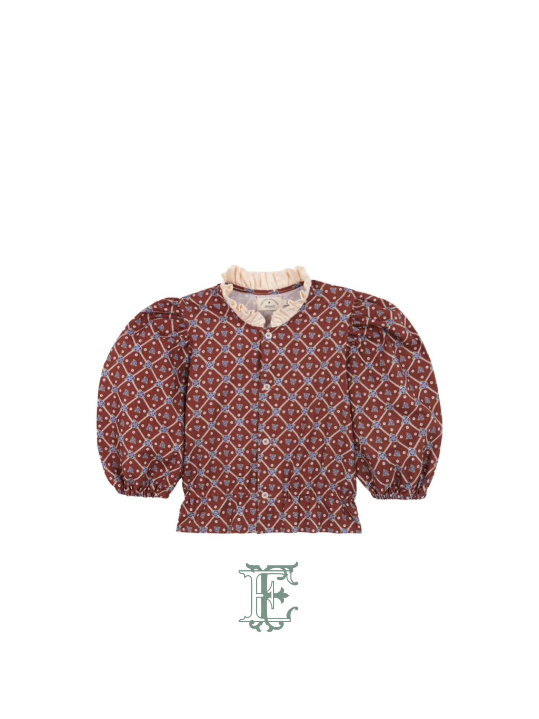 The Juliana Petit Shirt features a rich autumn print, sweet ruffle neckline, and classic button-front detailing. This charming top pairs beautifully with skirts or corduroy pants, offering a timeless look perfect for fall outings, family photos, and everyday wear.