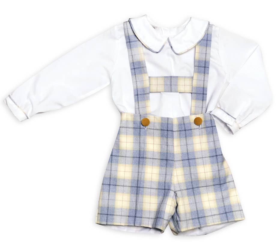 A timeless fall favorite, our Boys Fall Plaid Suspender Shortall Set combines classic charm and comfort in one picture-perfect outfit. Featuring a light blue and cream plaid shortall with buttoned suspenders, paired with a crisp white Peter Pan collar shirt, this set is ideal for family photos, church, or special outings. The soft cotton-blend fabric ensures cozy wear, while the tailored fit adds a refined touch. A must-have piece for your little gentleman’s fall wardrobe. 🍂